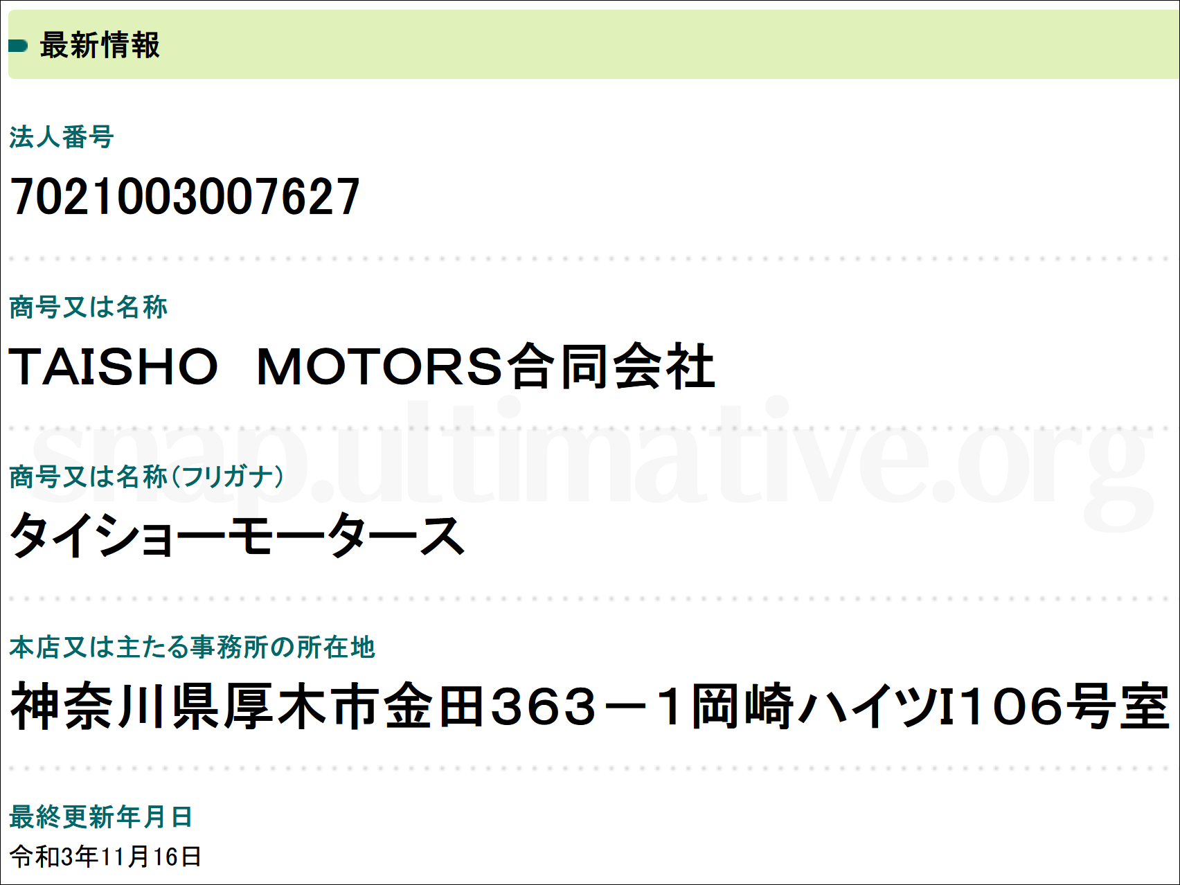 なお、一部の口コミではタイショウモータースが実在しない架空の会社であるかのように語られていますが、登記簿上は下記の通りに実在しています。